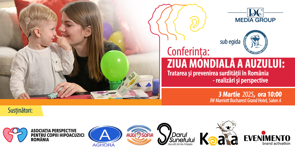 Ieri, 3 martie, a fost marcată în București Ziua Mondială a Auzului, printr-o conferință organizată de DC Media Group, sub egida Societății de ORL și Chirurgie Cervico-Facială, cu participarea asociațiilor de pacienți Perspective pentru copiii hipoacuzici, Audiosofia, Darul Sunetului și Koala. Evenimentul a avut drept temă principală „Tratarea și prevenirea surdității în România – realizări și perspective” și a fost onorat prin participarea: conducerii Ministerului Sănătății, prin dl. prof. univ. dr. Alexandru Rafila, ministru, Comisiilor de sănătate și Comisiilor pentru muncă și protecție socială din Parlament, prin dl. prof. univ. dr. Adrian Streinu-Cercel, Casei Naționale de Asigurări de Sănătate, prin d-na dr. Valeria Herdea, președinte și Societății de ORL și Chirurgie Cervico-Facială, prin dr. Șerban-Vifor-Gabriel Berteșteanu, președinte; a Direcției de Sănătate Publică a Municipiului București, a unor reputați medici din mai multe spitale precum Spitalul Clinic de Copii „Dr. Victor Gomoiu”, Spitalul Clinic de Urgență pentru Copii „Marie Sklodowska Curie”, Spitalul Clinic de Recuperare Iași, Spitalul Clinic Polizu, Asociației Serviciilor de Ambulanță din România, diverselor asociații ale persoanelor hipoacuzice.